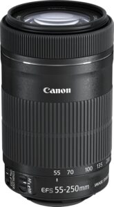The Canon 55-250mm STM is a popular telephoto lens that is popular among beginners.